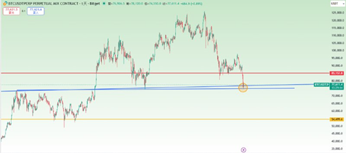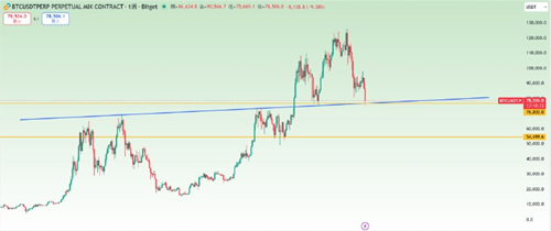 短期內重点关注76800美元附近的支撑位,这是短期最后一笔多单的尝试机会