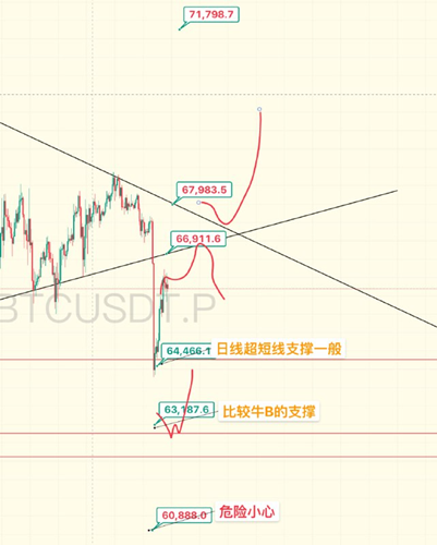我今天在直播中或者分析帖子中多次提到67000的剥头皮支撑,但临近睡觉单发布,避免夜长梦多,我想尝试更低的点位才能睡觉挂单,包括二次加仓空也一样,不能太近了,不然就是待在的羔羊。