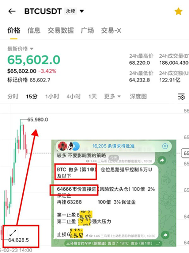 2月24日我们布局64666点位的BTC多单,实际这个策略第二个点位是63288加仓,但由于当天行情第一波插针差了80多U没挂上就撤销了,后来这里居然是上涨到7万的波段底部。这单最终是在65888全部止盈的,获利186%。提前告诉你63288加仓多记录