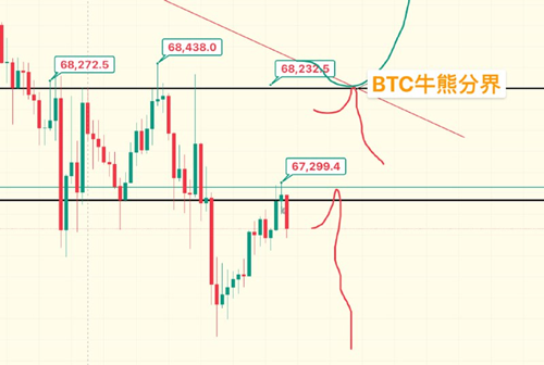 BTC的牛熊分界线不断在降低,本周前3天冲击68500~68300有3次都瀑布下来,而且今天日内冲击67200就有点萎靡不振了,空头趋势效果很明显。