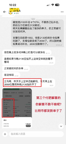 统一回复人太多:昨天直播找三马哥付费解套ETH的在2130加仓空的都解套了,既然都解套了还犹豫不跑?BTC今天不是都发了多空双吃单子?没有策略的时候,你根本不知道如何布局仓位、要不要逃命?没有专业的人盯盘你会?