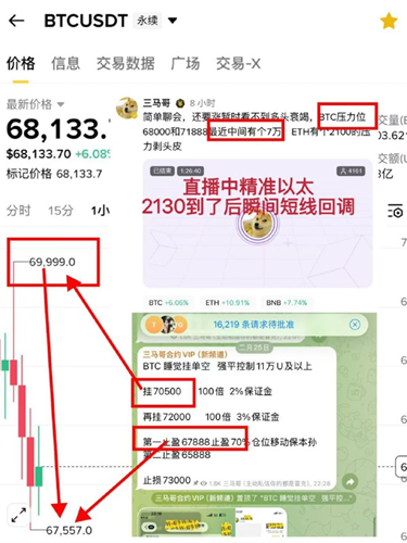 警惕连续下跌,昨天我们预判了67000剥头皮做多支撑,但是临近睡觉撤销了激进的多单,睡醒看到67000也拉升到67888了,也算个符合预期。更精准的66388做多差了70多U肯定有人多挂了100U抢跑了。👉🏻三马哥唯一手续肥8者注册