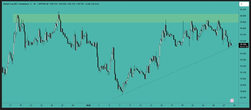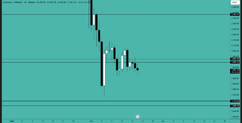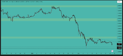 在经历了一波巨大的下跌之后,比特币K线逐渐变小。跌破周线图上7.2万美元的市场结构水平后,比特币持续承压。动能明显看跌,价格持续创出更低的高点。关键支撑位在6万美元至5.9万美元之间,而7.2万美元目前构成主要阻力位。在重新站稳该水平之前,市场前景依然谨慎看跌。