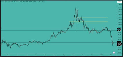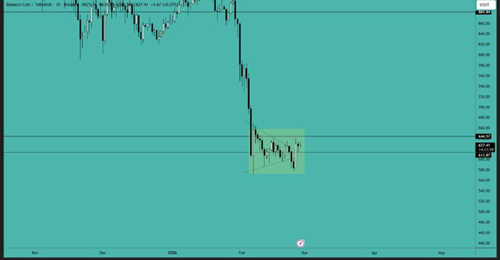 BNB 未能成功形成三角形形态,目前更倾向于盘整。一旦价格突破 660 美元或跌破 570 美元,价格可能出现大幅波动。将突破视为早期信号,并据此建仓。
