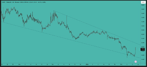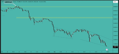 比特币目前交易价格低于90,000美元关口。在较低时间框架上形成了一个下降楔形,该三角形的突破将决定其下一步走势。