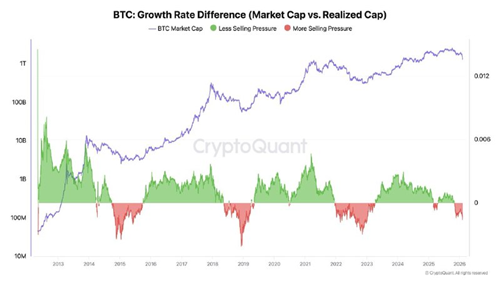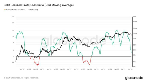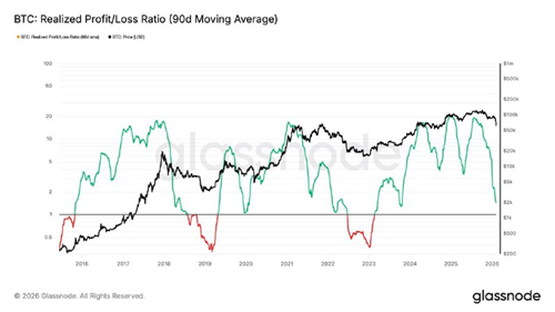 The Realized Profit/Loss Ratio (90D-SMA) has now fallen below 1, confirming a full transition into an excess loss-realization regime.