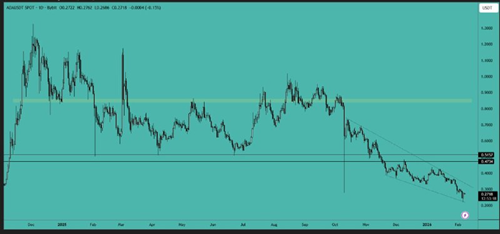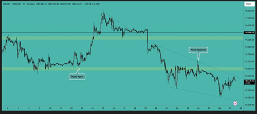 比特币目前交易价格低于 90,000 美元。在较低时间框架上形成了一个下降楔形,突破该三角形将决定其下一步走势。