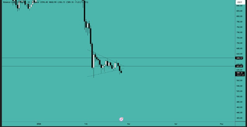 BNB 形成看跌三角旗形形态后被突破,目前正准备回调。如果您准备做空,目标价位在 570 美元附近的先前低点,并预期会出现新的更低低点。