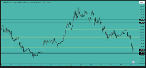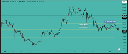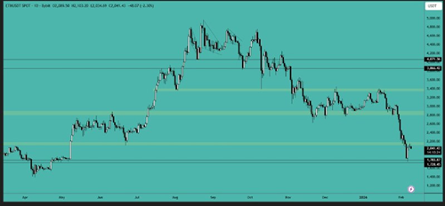 ETH正在跌破支撑区域。如果收盘价低于该区域,则为看跌信号,我们可能会看到价格下跌至2150-2300美元区间。请密切关注日线收盘价。