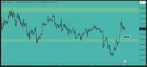 比特币已突破 66,000 美元的阻力位,目前在该阻力位上方交易。下一个目标是 72,000 美元区域,价格需要突破该水平才能获得进一步的上涨动能。
