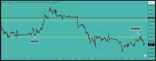 Bitcoin tested the resistance areas as expected and rejected again from there. We may see another test of the resistance area and lets see how it reacts there. Price need to hold above $90,000 level for building a bullish movement.