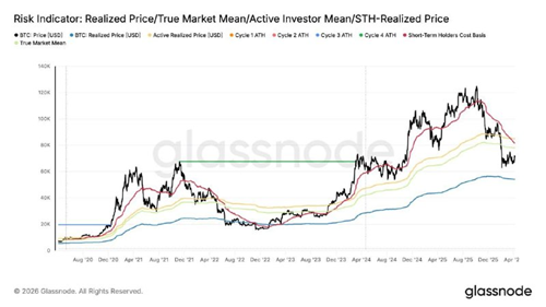 A sustained push above 75% would carry considerably more weight as bull market confirmation, while continued rejection near current levels reinforces the bear market recovery narrative. 突破 7 万美元并进入 7.2 万至 8.2 万美元的缺口令人鼓舞,但单次价格上涨不足以确认决定性的结构性转变。