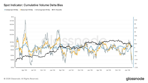 各交易平台 #CVD 均为负值,表明 #Distribution 活跃,而非被动缺口。在 CVD 稳定并出现建设性 #Divergence 信号表明自然需求吸收供应之前,价格仍将保持脆弱⚡️🎯👀