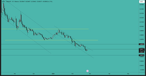 价格正接近关键支撑区域。您可以在 0.009000 美元附近建立多头头寸,并在回调时加仓。我们预计会出现一些吸筹,随后是一波持续上涨……