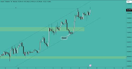 This turned out to be a fakeout, and Bitcoin had a significant upward move. The new resistance is around the $75,000 area, and a break above this will continue the upward trend.