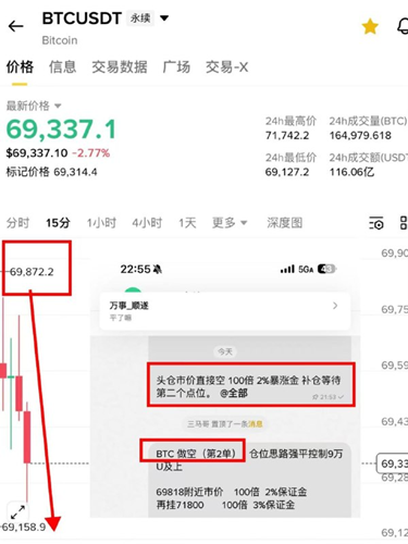 周四:第六单71000BTC空单 周三晚上23:30进场在周四下午13:30。70200附近止盈获利800点 使用100倍杠杆利润100% 👉 马前炮