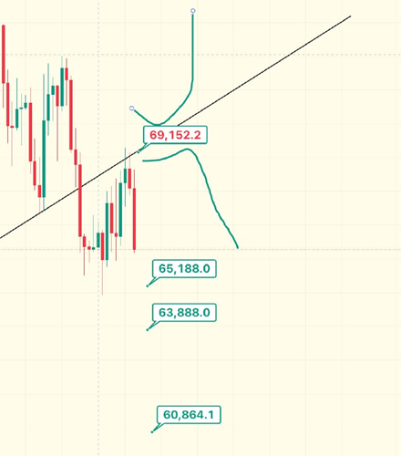 我日昨天睡觉前分析比特币69000压力位睡醒就涨到了,今天有个支撑在67888左右。