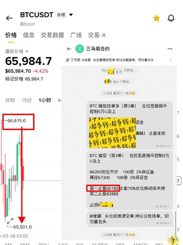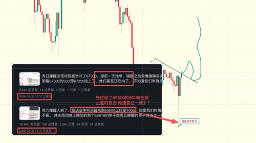 第八单66200做空 最低跌至65500 我们的止盈点是65188差300点可惜👉马前炮