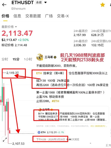 三天前都告诉你们了,在高位2138开多的。不需要加仓就能解套,但没有必要去割肉,今天是不是就涨回来了?所以说现在的行情还是熊市中的震荡。#ETH 👉🏻提前预判记录